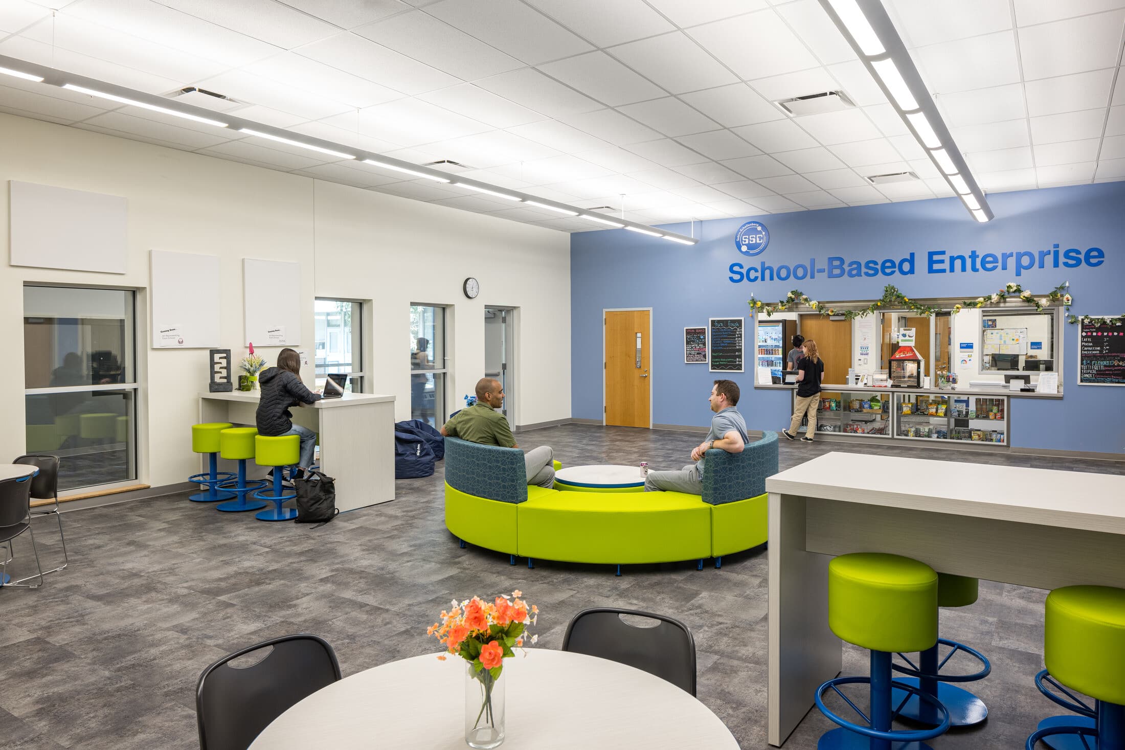 The Administration offices are at the heart of a smoothly running school. Located at the front of the school, with supervision of the main entry, parking and also into the school. Administrative offices should be located adjacent to Student Support Spaces but with separate student entries to both. Offices are needed for some staff who have frequent confidential conversations and unassigned offices are available to other staff that are located in open areas. Both Admin and Support Services should be welcoming and inviting to all, have good supervision within and to the rest of the school, and should be easily accessible.