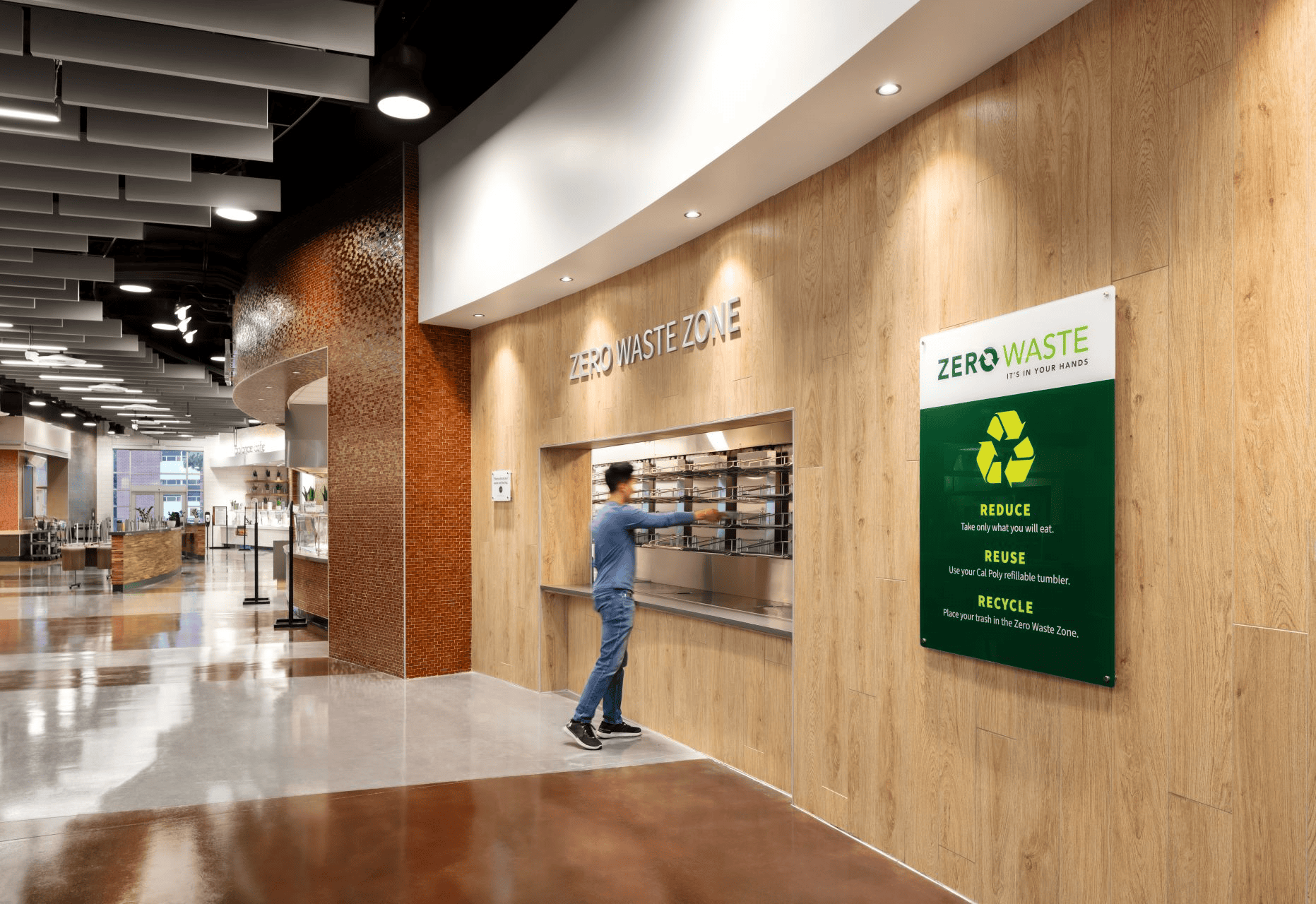 Provide clear and ample areas for waste collection and sorting. Position waste bins in clear and obvious areas during mealtimes, and allow for easy access by staff to transition to the exterior waste collection after meals are complete. Position exterior waste bins to be easily accessible by the waste collection company nearby to the food service area.