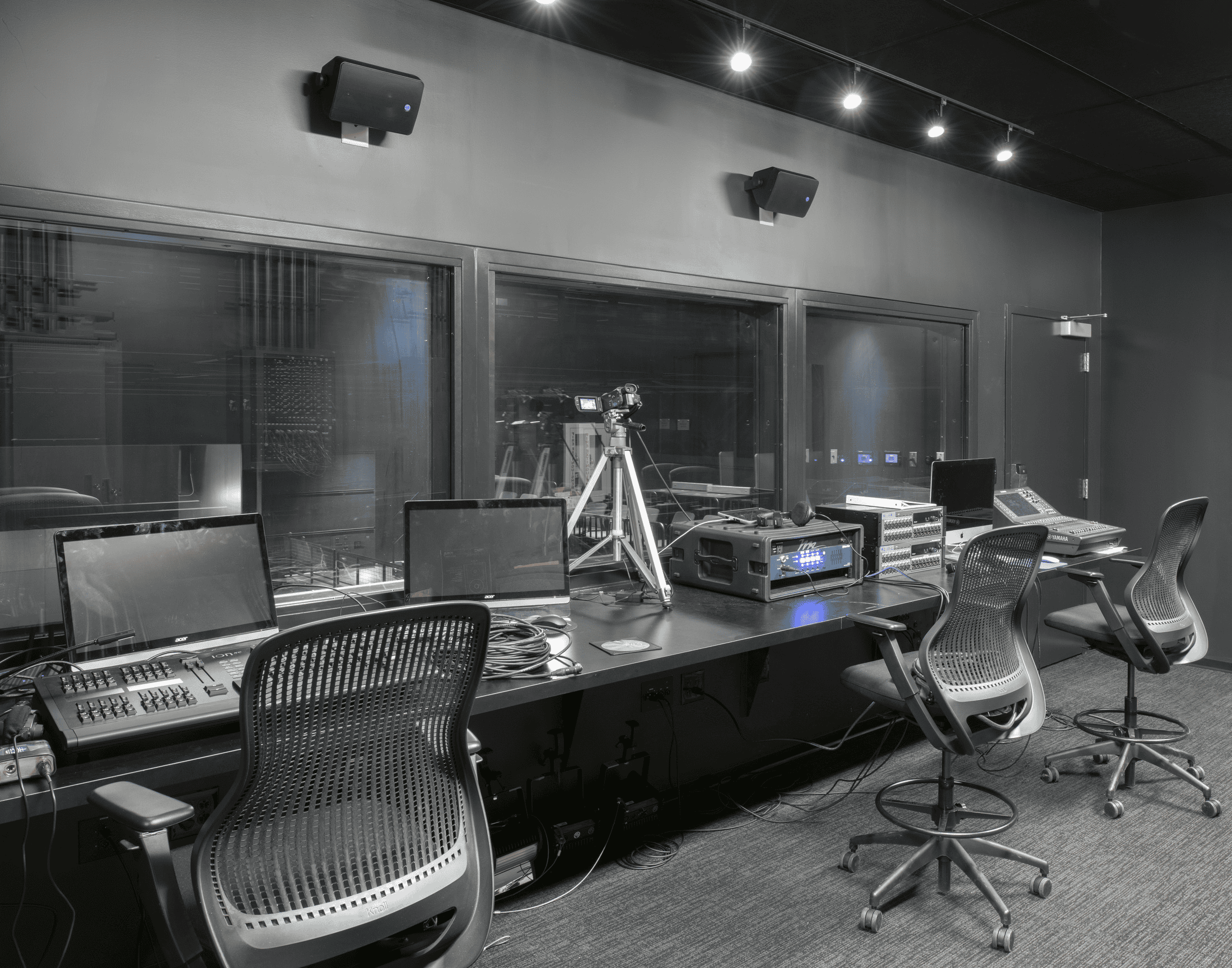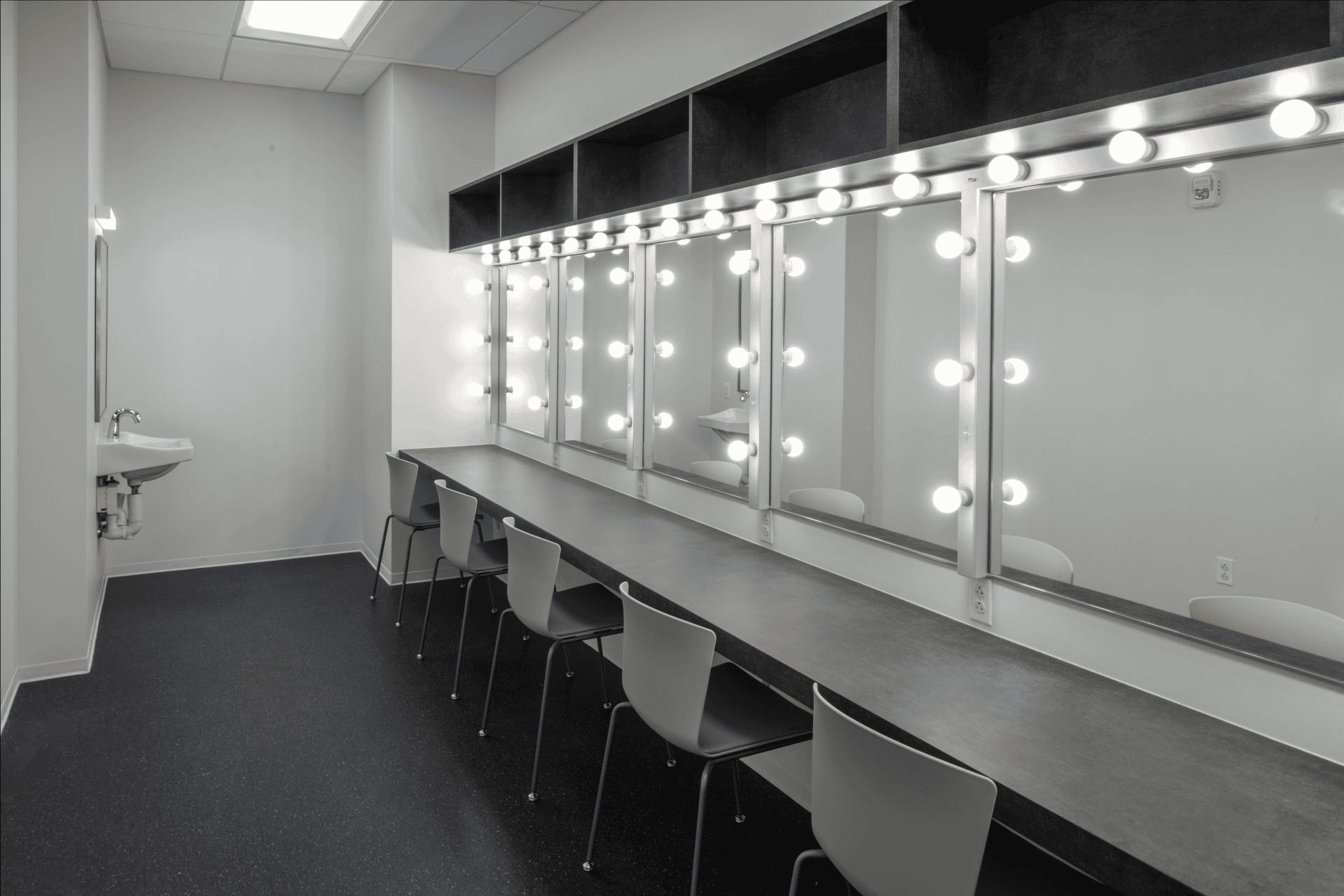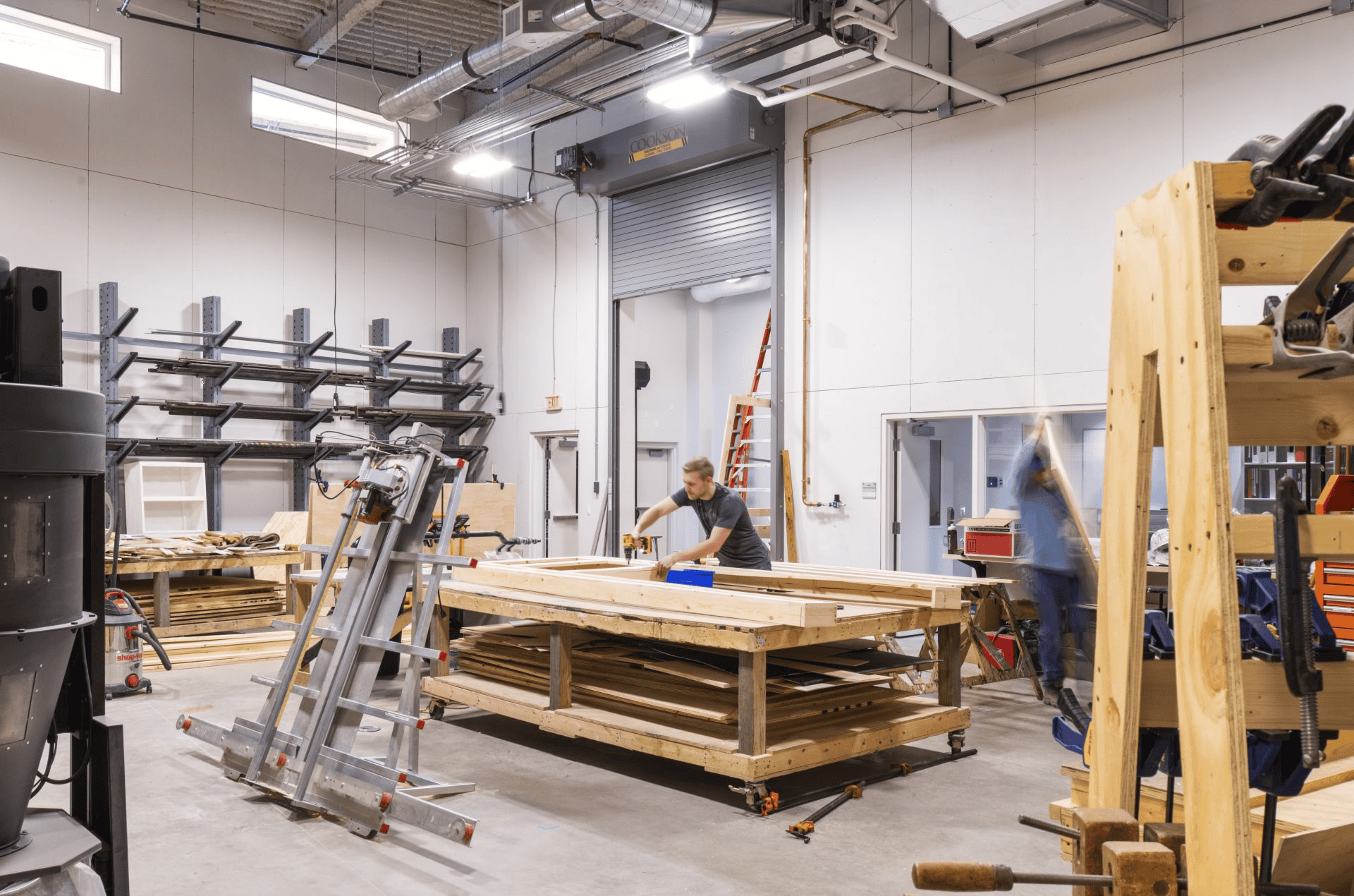 A scene shop for designing and creating sets shall be adjacent to the stage and accessible via large overhead doors for easy maneuvering between set building and stage.